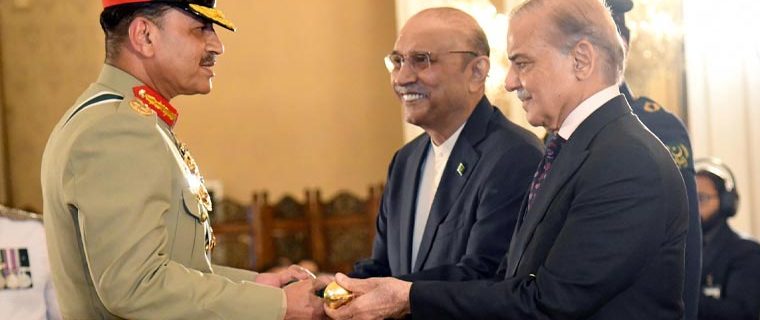 اسلام آباد: چیف آف آرمی سٹاف سید عاصم منیر کو ’بیٹن آف فیلڈ مارشل‘ سے نواز دیا گیا۔ آرمی چیف سید عاصم منیر کو ’بیٹن آف فیلڈ مارشل‘ دینے کی تقریب ایوان صدر اسلام آباد میں ہوئی، تقریب میں صدر مملکت آصف علی زرداری، وزیراعظم شہباز شریف، نائب وزیراعظم اسحٰق ڈار، سابق وزیراعظم نواز شریف، چیئرمین پیپلزپارٹی بلاول بھٹو زرداری نے شرکت کی۔ وفاقی کابینہ کے ارکان، سروسز چیفس، صوبائی گورنرز اور ارکان پارلیمنٹ کی بڑی تعداد، غیر ملکی سفارتکار، سول وعسکری حکام بھی تقریب میں شریک تھے۔ صدر مملکت آصف علی زرداری اور وزیراعظم شہباز شریف نے جنرل عاصم منیر کو بیٹن آف فیلڈ مارشل کا اعزاز دیا. انہیں یہ اعزاز بے مثال قیادت اور ملکی دفاع کے لیے گرانقدر خدمات کے اعتراف میں دیا گیا۔